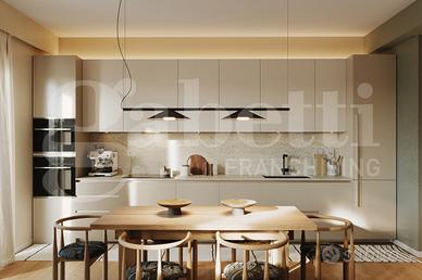 L'ingresso si apre su una zona giorno ampia e luminosa, caratterizzata da un soggiorno living con parete cottura a vista, pensato come vero cuore della casa: uno spazio moderno e accogliente con accesso diretto al balcone. La distribuzione degli ambienti è razionale e ben studiata, con un comodo disimpegno che separa in modo naturale la zona giorno dalla zona notte.