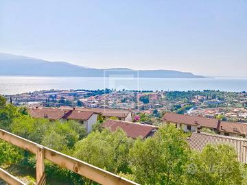 L'appartamento è disposto su due livelli con giardino privato di 200 mq ed ingresso indipendente e si compone di ampia zona living che si estende all'esterno grazie ai grandi infissi scorrevoli che regalano una scenografica vista sulla piscina e sul portico di 45 mq dove ammirare una vista lago incantevole e trascorrere momenti di relax unici, disimpegno e bagno al piano.