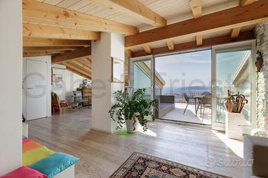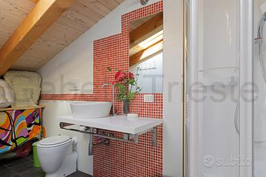 CHIADINO VIA DELL'EREMO ALTA - In un contesto residenziale esclusivo, proponiamo una proprietà unica nel suo genere. L'abitazione, non in condominio, con ingresso indipendente, su tre livelli si sviluppa prevalentemente al primo piano, con un ampio salone di rappresentanza con caminetto a legna (dotato di bocchette per il riscaldamento del piano superiore mansardato), una cucina abitabile ben organizzata con zona dispensa e una zona notte composta da una spaziosa camera matrimoniale, una camera singola e un bagno completo finestrato con vasca. La praticità quotidiana è garantita da una zona lavanderia dedicata e da un ripostiglio/cantina di generose dimensioni, anch'esso finestrato. Il comfort esterno di questo livello è assicurato da una profonda balconata coperta e da un secondo balcone di servizio. Salendo al secondo piano, frutto di una sopraelevazione, si accede a una mansarda dalle altezze generose, con ampi velux e completamente vivibile, servita da un secondo bagno di servizio. Questo livello culmina nella spettacolare terrazza fronte mare: un vero salotto all'aperto con vista impareggiabile. Box grande. Classe F EPgl 169,43 €490.000 www.gabettitrieste.it