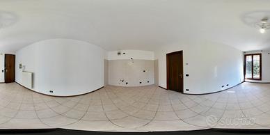 L'ingresso indipendente dall'accogliente giardino che circonda l'appartamento offre un accesso diretto alla luminosa zona giorno, caratterizzata da uno spazio open space con cucina a vista e soggiorno. La vetrata che affaccia sul giardino permette di godere di luce naturale durante tutto il giorno, creando un'atmosfera calda e accogliente.