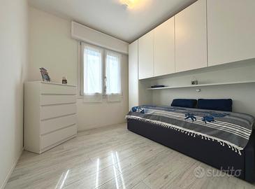 L'unità immobiliare oggetto della presente proposta è situata al piano rialzato con accesso indipendente e si compone di zona giorno con divano letto ed angolo cottura con lavastoviglie e lavatrice, terrazzo orientato a ovest con tenda da sole, disimpegno, camera con letto matrimoniale e antistante terrazzo con vista panoramica sulla pineta in lato ovest, camera con letto singolo e letto estraibile, bagno finestrato con box doccia. All'unità immobiliare è abbinato un posto auto privato all'interno dell'autorimessa situata al piano seminterrato.