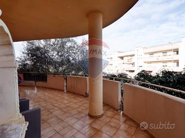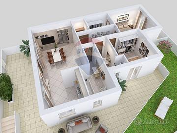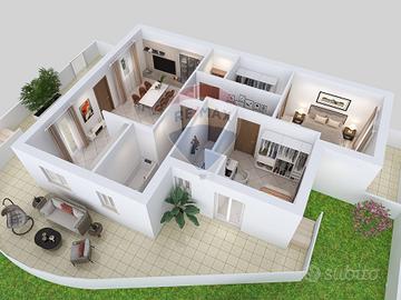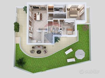Appartamento a piano rialzato con ingresso indipendente di 3 vani più doppi accessori di mq 98 circa, e spazi esterni (veranda) di mq 260 circa composta da: ingresso, salone cucina open-space, disimpegno, una camera da letto singola, una camera da letto matrimoniale, due bagni.