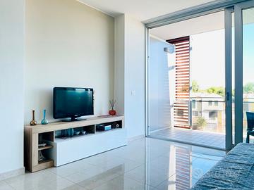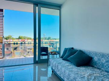 L'immobile situato all'ultimo piano di una palazzina dotata di ascensore, è impreziosito da ampie vetrate che lo rendono particolarmente luminoso e arieggiato, dalle quali, sia dalla zona giorno che dalla camera, si accede ad un ampio terrazzo dotato di tavolo e divano, ideale per trascorrere dei momenti insieme all'aperto, come la colazione, l'aperitivo o la cena, godendosi l'aria fresca del mare.