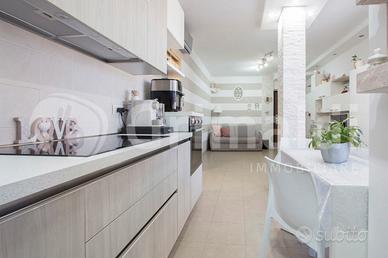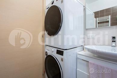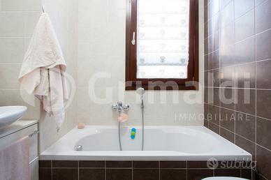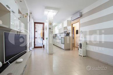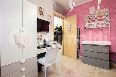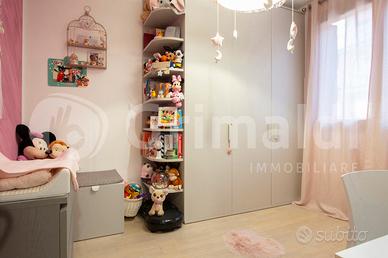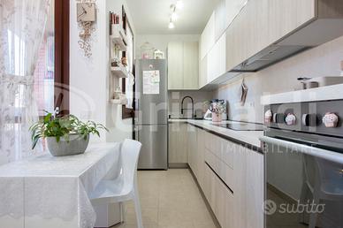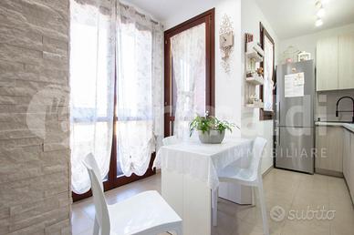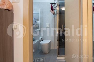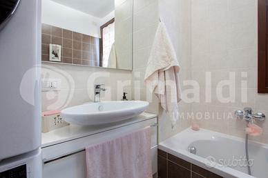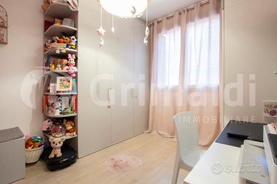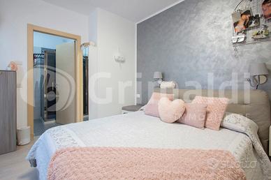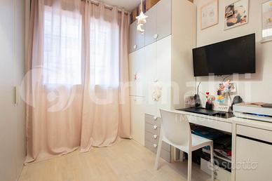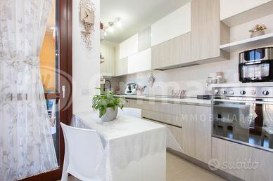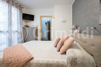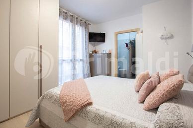 ingresso in soggiorno, angolo cottura aperto, terrazzino, disimpegno zona notte, bagno padronale con finestra, camera singola, camera matrimoniale con bagno dedicato con finestra. Esposizione tripla, climatizzatore, zanzariere, riscaldamento autonomo, infissi esterni in legno con doppi vetri, parquet nella zona notte.