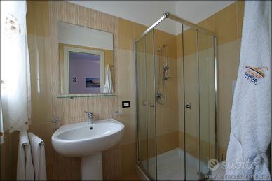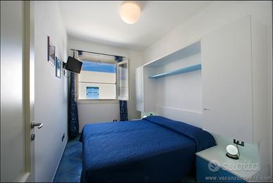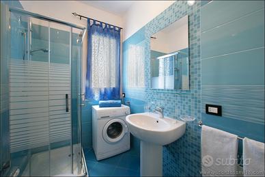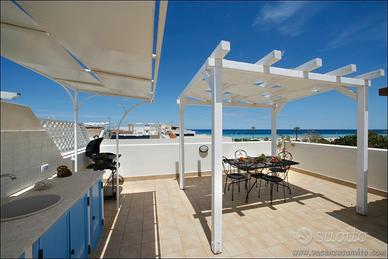 La casa è stata costruita nel 2012 pertanto è nuova nella struttura che nell'arredamento. Per gli ospiti, compreso nel prezzo, si ha l'uso esclusivo di 2 bici, adsl wifi, uso esclusivo di 1 posto auto in garage al chiuso. Si tratta di un primo piano ampio circa 75 m/q e si trova a soli 50 metri dalla spiaggia e 100 metri da piazza Marinella, una tra le due principali del paese. Cucina-soggiorno luminosa con divano letto (una piazza e mezza) e con vista mare dal balcone. Due camere da letto, una matrimoniale ed una tripla, entrambe con TV in camera, due bagni. La seconda camera matrimoniale ha una finestra vista mare. Uno dei due bagni è in camera, mentre il secondo è accessibile dal corridoio ed è dotato di lavatrice. In corridoio si trova la scala a chiocciola che porta al terrazzo da dove si gode di una strepitosa vista sulla spiaggia di San Vito lo Capo, da monte Pizzo Monaco fino al faro. Questa è allestita in parte con infrastruttura in pergolato bianco semicoperta, due lettini da esterno per prendere il sole, barbecue e lavandino, due vasi arredo che rendono l'ambiente più verde ed accogliente. Tutti gli ambienti sono dotati di aria condizionata. ATTESTATO CERTIFICAZIONE ENERGETICA: classe B