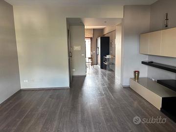 L'ingresso si apre su una vasta area dove l'ampio salone e la cucina abitabile possono essere vissuti come un unico, scenografico ambiente cucina-soggiorno. Questa soluzione permette di godere contemporaneamente del terrazzino panoramico sul salone e del balcone della cucina, creando un flusso continuo di luce e aria.