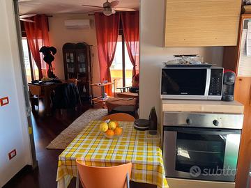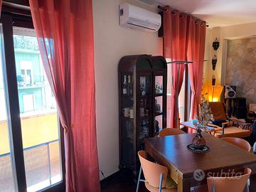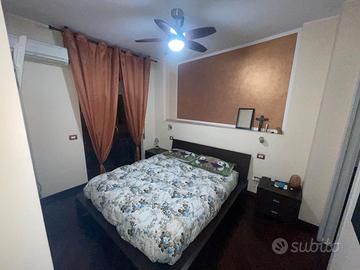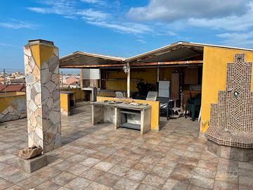Privato vende, senza mediazione immobiliare, appartamento in piccolo condominio di 3 unità abitative, al secondo ed ultimo piano senza ascensore, molto luminoso con tripla esposizione. Nella via Roma, in zona servita dalle principali attività e servizi, Vi propongo un appartamento molto grazioso di 93 mq commerciali e 80 calpestabili da visura catastale; nel dettaglio 80 mq al secondo piano e 103 mq di terrazza sovrastante, completa la proprietà il parcheggio auto/moto di 25 mq con accesso tramite cancello elettrico. L'appartamento è così composto: ingresso su ampio soggiorno, cucina abitabile, bagno, disimpegno, camera matrimoniale con cabina armadio molto ampia, seconda camera. completano due balconi che affacciano sulle due vie principali dotati di tende solari con avvolgimento manuale e una veranda attrezzata con lavatrice, lavello e stenditoio. Alla veranda si può accedere sia dal bagno che dalla cameretta, è possibile chiuderla, finestrandola, per via della sanatoria fatta dal precedente proprietario. Pavimento in parquet Iroko di colore scuro realizzato su tutta la superficie della casa, trattato contro graffi umidità e acqua; infissi artigianali realizzati in pino di Svezia e con doppio vetro camera. La grande parete del soggiorno è rivestita interamente in pietra di quarzite naturale e illuminata da faretti a LED incastonati; pronto l'impianto satellitare e per home Theater; è anche ripristinabile il caminetto, presente la canna fumaria che dà sulla terrazza. Ristrutturato nel 2012 anche negli impianti idrico ed elettrico. Attualmente raffredato e riscaldato con 3 split, predisposizione per l'aggiunta di termosifoni con alimentazione a bombolone, a gasolio tramite la caldaia condominiale ora staccata o con impianto a gas. Nella Terrazza troviamo un'ampia cucina con fuochi, lavello, frigo, attacco antenna per TV ed esternamente alla copertura, una doccia con parete in mosaico e un barbecue con pietre refrattarie, ben illuminata