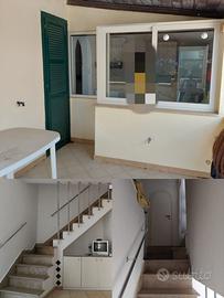 1° livello ampia sala da pranzo con divano letto, camera da letto matrimoniale, bagno con doccia e lavatrice, cucina e due ampie terrazze