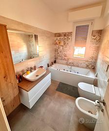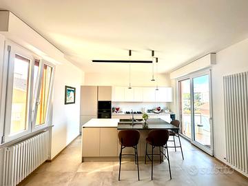 Internamente, l'immobile è stato completamente ristrutturato nel 2024, con impianti elettrico e termoidraulico nuovi. Nel soggiorno e nelle camere, il pavimento è parquet in rovere naturalizzato ad acqua, mentre nei bagni e in cucina è stato utilizzato un rivestimento in ceramica. Le finiture di pregio rendono l'appartamento lussuoso e confortevole: nella zona giorno, tavolo, sedie e sgabelli; condizionatori Daikin con pompa di calore (uno nel soggiorno e uno nella zona notte); la domotica gestisce serrande elettriche e termostato. L'isola in cucina è dotata di tritatutto e rubinetto per acqua microfiltrata, ed è realizzata con una pregiata lastra in quarzo nero, mentre la cucina è in quarzo bianco. Tutti gli infissi sono nuovi e dotati di zanzariera. Inoltre sono stati sostituiti cassettoni e serrande, anche queste in domotica.