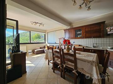 Varcando la soglia ci accoglie un elegante salotto ed attraverso un ampia porta scorrevole si ha accesso all'ampia zona giorno composta da una grande cucina e ulteriore angolo relax con divani.
