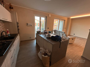 Vendo quadrilocale libero da vincoli, di recente costruzione. Finiture di pregio. Composto da: ingresso living, bagno, due ampie camere da letto. Presenza di: antifurto, climatizzatore, impianto di ventilazione meccanica controllata, tapparelle elettriche. Cucina arredata con penisola. Completano la proprietà: box auto + cantina, raggiungibili con ascensore.