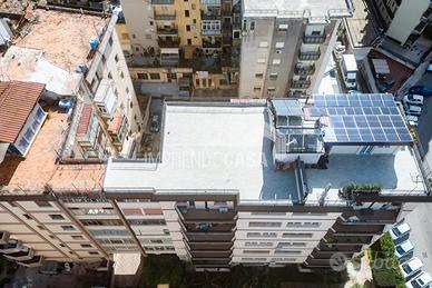L'immobile, posto al 6° piano con ascensore, è dotato di: Porta d'ingresso blindata, pavimentazione in parquet, porte interne in legno massello, infissi interni pvc e vetrocamera, serrande in pvc, impianto di riscaldamento autonomo, caldaia nuova, termostato, metano, climatizzatori, videocitofono, impianto solare termico per acqua calda sanitaria e tripla esposizione. Completano la proprietà il terrazzo sovrastante di 125 mq, due verande (15 mq e 5 mq), balcone mq 7, cantina di mq 6, area condominiale utilizzata per posti moto.