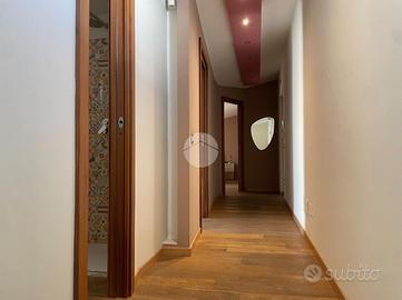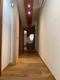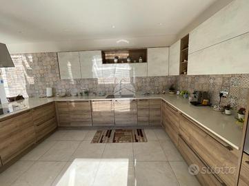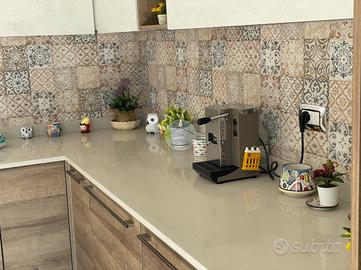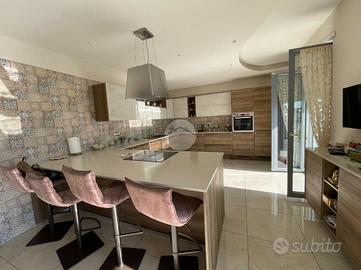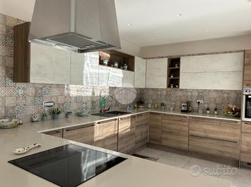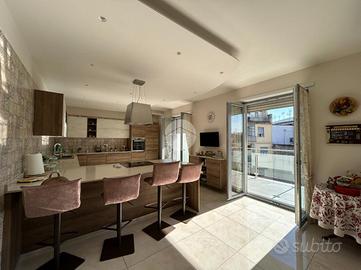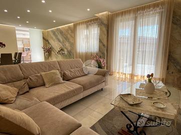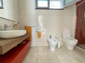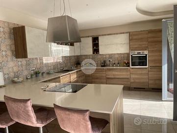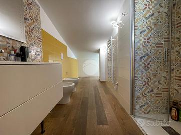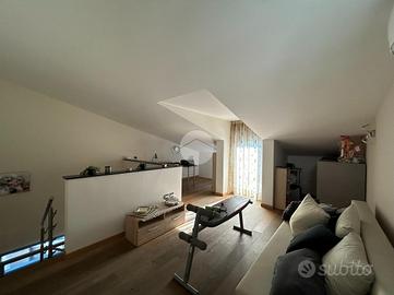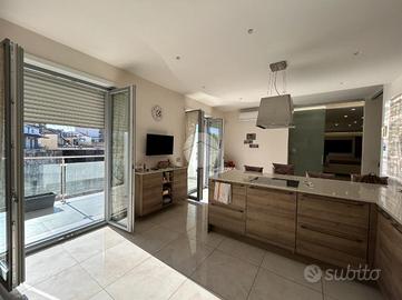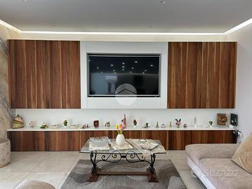 Il piano giorno è il cuore scenografico dell'abitazione: un soggiorno ampio e luminoso, caratterizzato da una parete decorativa che diventa elemento d'arredo e da un angolo TV studiato per un design minimale e pulito. Una porta scorrevole, elegante e discreta, introduce alla cucina con penisola, concepita come spazio sociale, ideale per chi ama condividere momenti, preparare, conversare. Da qui si apre un vero gioiello dell'immobile: un outdoor articolato tra balcone e ampia terrazza, un ambiente esterno attrezzato per essere vissuto, che amplia la casa con la stessa raffinatezza degli interni. Il bagno per gli ospiti e il vano scala completano il livello.