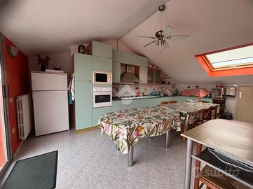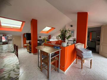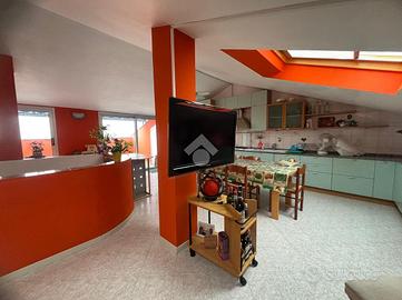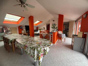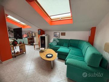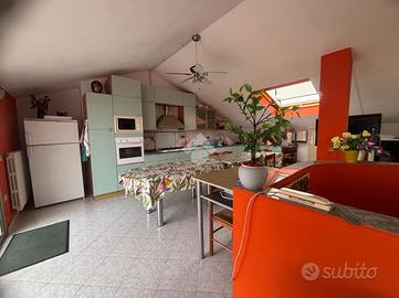 Una scala interna ci conduce al piano mansardato, composto da una luminosa e spaziosa zona giorno open space adibita a soggiorno con cucina a vista servita da due porta finestra con accesso ad un terrazzo solarium di circa 15 mq. completo di pensilina antipioggia dove si trovano anche un ripostiglio e il vano caldaia.