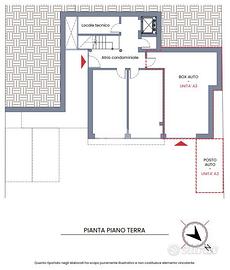 Al piano terra è presente un garage di circa 45 mq con basculante motorizzato, accompagnato da un pratico posto auto esterno di 12,5 mq.