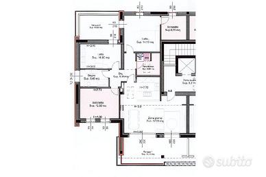 L'attico si compone di quattro locali, tra cui tre camere da letto e due bagni, garantendo spazio e privacy per tutta la famiglia.