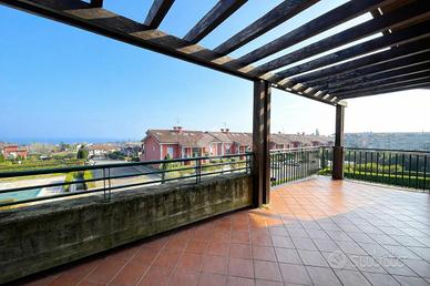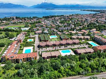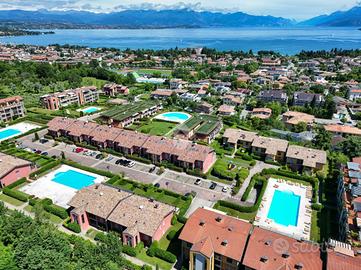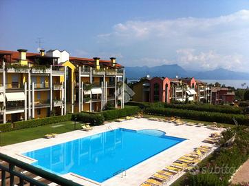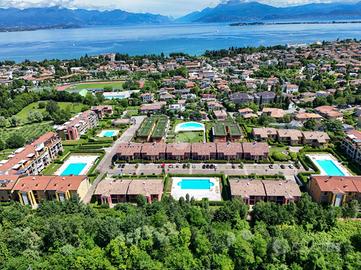 VISTA LAGO. All'interno dell'esclusivo Residence Vista Lago, dotato di 5 piscine e servizio di portineria, appartamento trilocale con doppi servizi e BELLISSIMA VISTA LAGO. L'appartamento, servito da ascensore, si trova al secondo e ultimo piano ed è così composto: l'ingresso apre direttamente sulla zona giorno dove si ha accesso al terrazzo dal quale è possibile godere di splendida vista lago a 180 gradi, la cucina è abitabile e anch'essa ha accesso alla terrazza. La zona notte è composta dalle due camere da letto, una matrimoniale con bagno privato e una doppia, ulteriore bagno e ripostiglio. Completa la proprietà la presenza di un ampio garage direttamente raggiungibile con l'ascensore. La proprietà è già dotata di riscaldamento a pavimento ed aria condizionata.