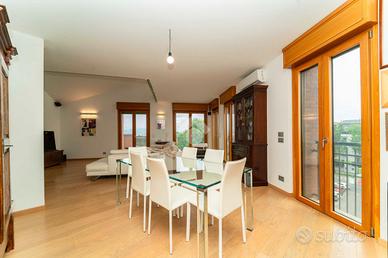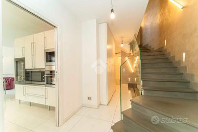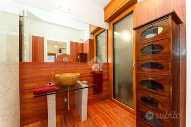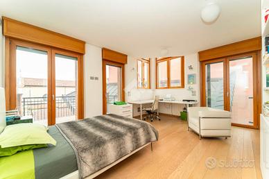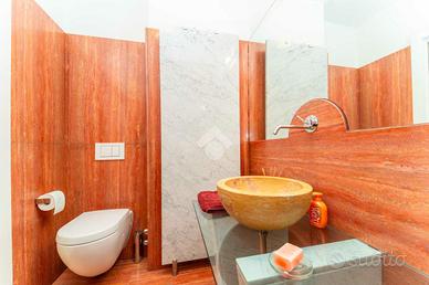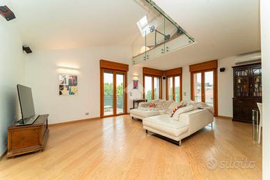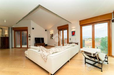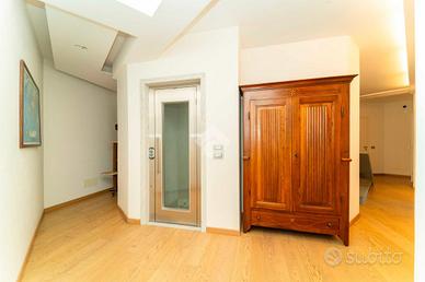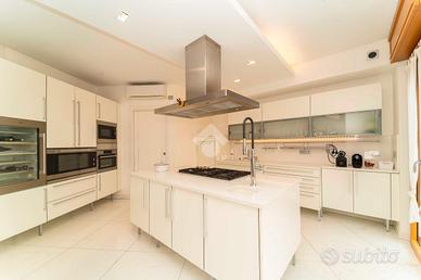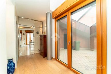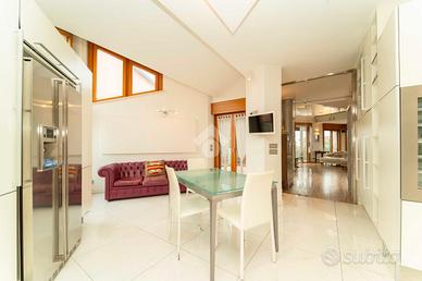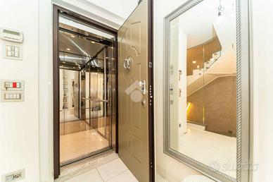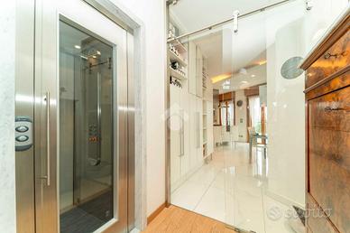 Nel cuore di Grugliasco, prestigioso Attico in condomino signorile del 2012 su progetto dell'architetto Elio Luzi e con classe energetica A1+++. Edificio antisismico e senza barriere architettoniche. Facciata in mattoni in paramano provenienti dalle fornaci di Ballatore. Serramenti in Rovere Massello di Slavonia, con una struttura resistentissima in grado di sostenere i vetri antisfondamento con doppia camera: vetro 4+4, pellicola antisfondamento, vetro temperato da 5 mm, altra camera con gas Argon ed altro vetro 4+4 con pellicola antisfondamento. Tutte le aperture sono provviste di zanzariera. L'abitazione si sviluppa su tre piani di circa 400 mq e circa 200 mq di interrato dove hanno sede un'autorimessa per oltre 5 posti auto ed una cantina di 40 mq. Dall'elegante ascensore condominiale, si accede direttamente alla zona giorno, tramite un portoncino blindato; l'accesso a questo piano dall'ascensore condominiale deve essere autorizzato dalla proprietà. La zona giorno di circa 200 mq ingloba una cucina di 40 mq, un ampio locale lavanderia, un corridoio con armadiature su misura. Il pavimento è in Gress Porcellanato 80x80. Allo stesso piano un ampio e luminoso salone con zona pranzo, pavimentato con doghe in Rovere Slavonia. Completa la zona giorno un bagno a lastre di marmo in travertino rosso; il termoarredo è in Marmo di Carrara; il lavandino è composto da una ciotola in marmo rosso di Travertino su lastra in cristallo, e rubinetto a cascata. Al piano sottostante, nella zona notte alloggiano 2 ampie camere matrimoniali di 24 e di 28 mq con cabine armadio. I pavimenti sono in Rovere Slavonia a doghe. Il bagno patronale è tutto in Marmo di Carrara completo di sanitari sospesi, vasca Teuco a conchiglia con cascata; il doppio lavandino è ricavato da un blocco di massello in marmo scavato. Sopra la zona giorno, si trova un ulteriore piano che si affaccia sul salone e che è adibito a relax e studio. In un ambiente riservato alloggia una vasca doccia panoramica con cr...