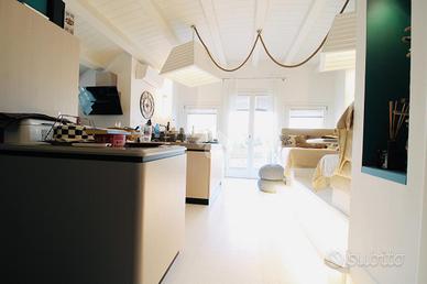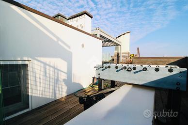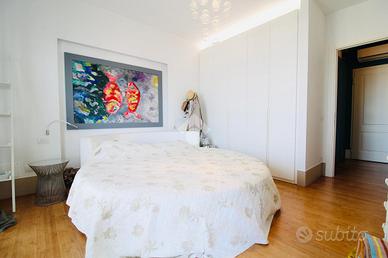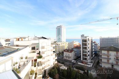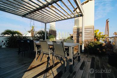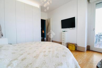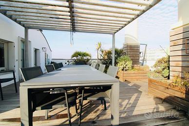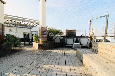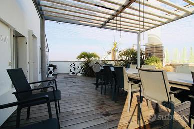 In Piazza Carducci proponiamo in vendita un prestigioso attico vista mare sviluppato su due livelli, situato al sesto e settimo piano di un edificio signorile dotato di piscina condominiale e ampio spazio verde comune finemente curato. L'immobile, caratterizzato da finiture di pregio, riscaldamento a pavimento e aria condizionata, garantisce comfort abitativo in ogni stagione. Al sesto piano si trova l'ingresso che conduce alla zona notte composta da una camera matrimoniale, un soggiorno elegante con mobile TV a scomparsa, un disimpegno con bagno finestrato dotato di box doccia, e una seconda ampia camera matrimoniale con letto a baldacchino. Completa il livello uno spazioso terrazzo perimetrale, condiviso tra le camere e il soggiorno, ideale per momenti di relax all'aperto. Una comoda scala interna conduce al settimo piano, dove si sviluppa una moderna e luminosa cucina open space con piano cottura a induzione, integrata a un secondo soggiorno situato su un piacevole piano rialzato. Sullo stesso livello trovano spazio un bagno adibito a lavanderia, dotato di ampio box doccia, e un'ulteriore camera matrimoniale. Tramite portafinestra, si accede direttamente all'ampio lastrico solare di circa 100 mq, con esposizioni rispettivamente a sud-est e a nord, dotato di una vasca idromassaggio, un tavolo per 12 persone, il tutto accompagnato da una vista mare mozzafiato. Perfetto come area privata per living esterno e intrattenimento. La proprietà si completa con due garage di 30 mq ciascuno, entrambi equipaggiati con basculante motorizzato. Un immobile unico nel cuore della città, che unisce eleganza, privacy e servizi esclusivi, ideale per chi cerca una residenza raffinata con ampi spazi interni ed esterni.