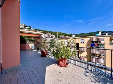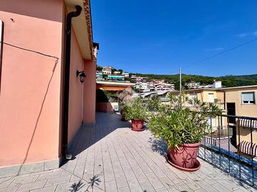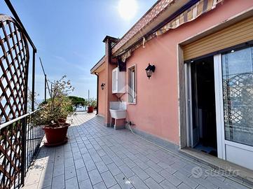 La soluzione presenta l'ingresso sul disimpegno che conduce alla luminosa zona giorno con vista panoramica e sfogo sulla terrazza angolare di circa 100mq anch'essa con vista panoramica; di seguito troviamo la cucina abitabile recentemente rinnovata, due ampie camere da letto matrimoniali, il pratico bagno finestrato con doccia ed il ripostiglio.