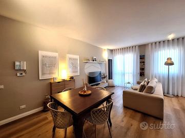 RESIDENZA "IL PORTICO NEL PARCO", ULTIMO PIANO CON DUE TERRAZZI Se cerchi una dimora che non sia solo spazio, ma un'espressione di stile e cura meticolosa, questo appartamento è il risultato di una recente e sapiente opera di rimodernamento che ha saputo fondere design contemporaneo e finiture di alto pregio. Varcata la soglia, si viene accolti dalla bellissima zona giorno inondata di luce naturale, dove ogni centimetro è stato pensato per il comfort; è dotata di balcone e di un'intima terrazza, un vero salotto all'aperto perfetto per i vostri momenti di relax. La cucina, separata dal living, mantiene la sua identità funzionale senza rinunciare alla modernità estetica. Il disimpegno è stato trasformato in una lavanderia a scomparsa d'eccellenza, grazie a un'armadiatura su misura che ottimizza gli spazi con eleganza; il bagno è finestrato con box doccia. Salendo al piano superiore, l'atmosfera si fa ancora più riservata, qui troviamo la zona notte con entrambe le camere che godono dell'accesso diretto a un secondo terrazzo, offrendo una vista privilegiata; la camera matrimoniale è accessoriata da una cabina armadio dedicata, il sogno di chi ama l'ordine e lo stile. Completa il piano un secondo bagno finestrato garantendo massima praticità alla zona notte. Questa non è una semplice abitazione, ma una scelta di vita per chi esige finiture ricercate e una distribuzione degli spazi intelligente: portoncino blindato, porte interne in legno, serramenti in legno douglas con doppi vetri e zanzariere, predisposizione impianto d'allarme, impianto aria condizionata con 3 split + motore sul terrazzo zona notte, pavimentazione in LVT con zoccolini in legno massello bianco modanato rifatti a nuovo a maggio 2024, carta da parati posata sulla parete della cucina e della cameretta a maggio 2024, scala interna in extra-capitolato con illuminazione led sottostante ad ogni gradino, tenda da sole 4 mt motorizzata e con sensori vento installata a giugno 2023, doccia rifatta completam