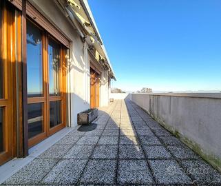 NOVENTA PADOVANA (loc. Oltrebrenta) Cosa sapere sull'immobile? Proponiamo in vendita esclusivo attico al quinto ed ultimo piano con terrazzone di 60 mq che affaccia lungo la Riviera del Brenta. L'immobile è servito di ascensore e dall'ingresso si percepisce fin da subito la luminosità e ampiezza degli ambienti che lo caratterizzano. Infatti, sia la zona living che la camera padronale, affacciano sul terrazzo abitabile che regala una vista incantevole, ma soprattutto privacy. La zona giorno è composta da un magnifico soggiorno di 40 mq e da una cucina separata ed abitabile, dotata di un secondo poggiolo. Si precisa che, l'armadiatura che fa da separazione tra cucina e soggiorno si può tranquillamente rimuovere per creare una zona living open space, per chi lo desiderasse; inoltre, anche i muri del disimpegno d'ingresso non sono portanti, pertanto si potrebbe creare una zona living di 60 mq. Il reparto notte si divide in due camere da letto matrimoniali, le quali condividono una cabina armadio comunicante. Infine, due bagni finestrati, di cui uno con poggiolo, completano la soluzione. L'immobile dispone anche, appena accanto alla porta d'ingresso, al piano (che è totalmente dedicato), di una lavanderia. Al piano interrato, un garage singolo direttamente raggiungibile con ascensore. Diversi parcheggi sono poi disponibili sotto casa. Ulteriori informazioni? La soluzione proposta nasce nel '70 ed è dotata di finiture di pregio come ad esempio le porte ed i copri termosifoni di legno intagliato a mano ed il terrazzo veneziano; nonostante sia stata sempre manutenuta, necessita di qualche lavoro di ristrutturazione. L'immobile è dotato di infissi in vetrocamera, la maggior parte delle tapparelle sono state motorizzate ed il terrazzo è stato ristrutturato. Le utenze sono autonome, eccetto l'acqua che è condominiale. Cosa sapere sulla zona? L'immobile si trova in una via principale, a due passi da Stra e dai suoi servizi quali bar, ristoranti, negozi di prima necessi