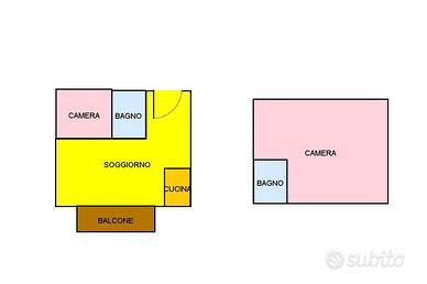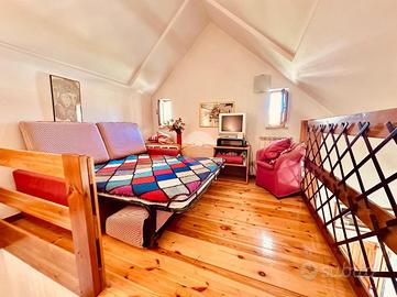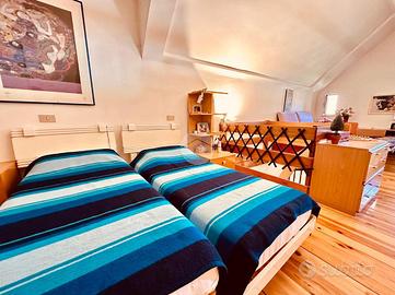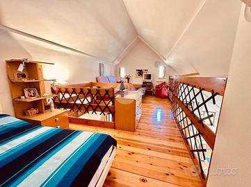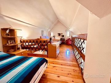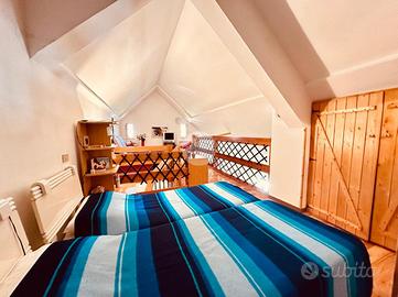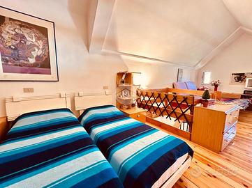 La soluzione è così disposta: entrando ci accoglie un'ampia e luminosa zona giorno open-space con angolo cottura e camino, proseguendo una camera da letto matrimoniale e un bagno con doccia. Salendo al piano superiore troviamo due camere da letto unite e un ulteriore bagno.
