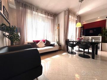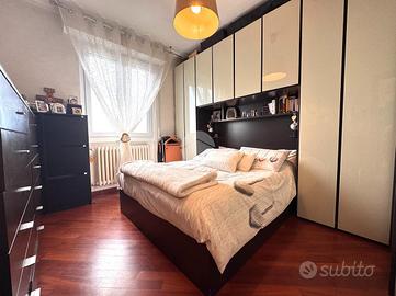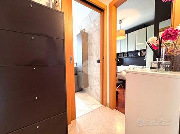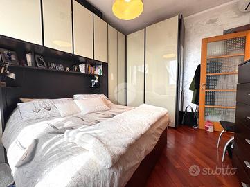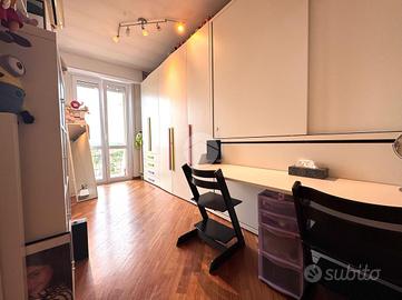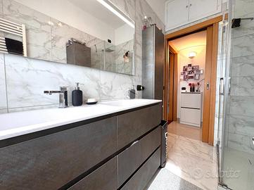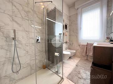 La zona notte comprende due camere da letto, una matrimoniale e una singola, oltre a un bagno finestrato completamente ristrutturato con doccia walk-in moderna e finiture di pregio. L'appartamento è dotato di doppia esposizione, che garantisce ottima areazione e luminosità in ogni ambiente.