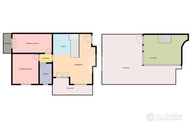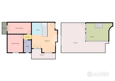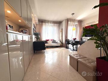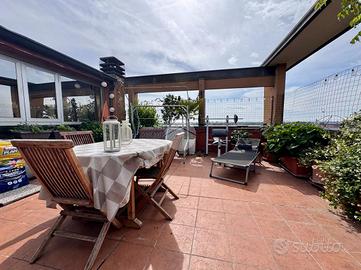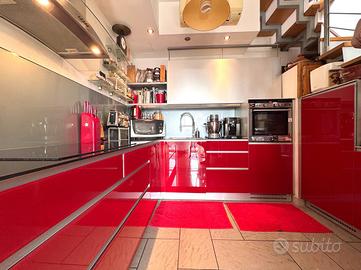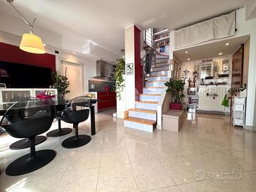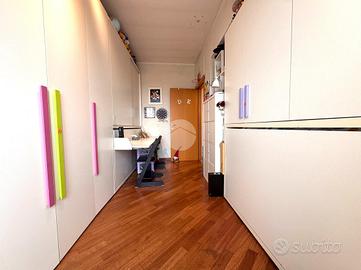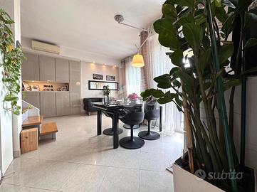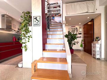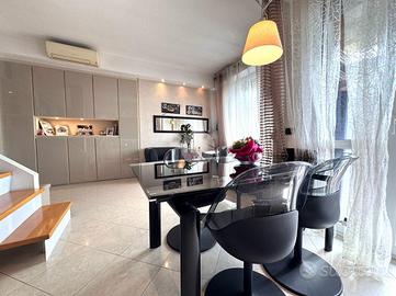 L'ingresso si apre su una luminosa zona giorno con soggiorno e cucina separata, entrambi con accesso diretto al primo terrazzo. Una comoda scala interna conduce al piano superiore, dove si trova un secondo terrazzo al nono piano, ideale per momenti di relax, pranzi all'aperto o per creare una zona verde privata con vista panoramica.