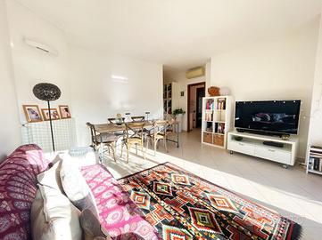 Dall'entrata principale si accede a un disimpegno che distribuisce gli spazi: un'ampia cucina, un soggiorno (dotato di tapparella elettrica) e la zona notte che ospita due camere da letto e due bagni finestrati. Inoltre due balconi, accessibili rispettivamente dalla cucina e dalla cameretta. L'immobile è dotato di riscaldamento autonomo e impianto di condizionamento. Completano la proprietà un ripostiglio, una cantina ed un box (23 mq). - LIBERO IN ESTATE 2026 -