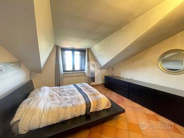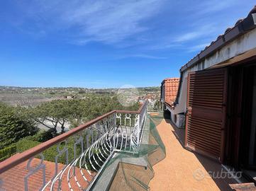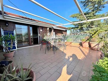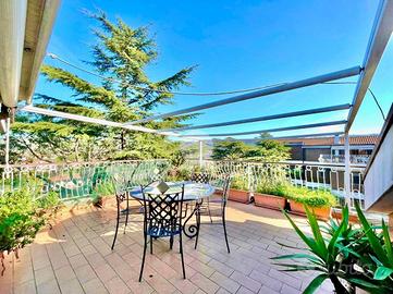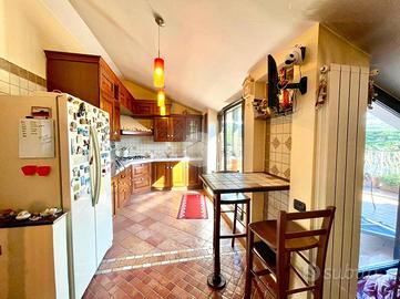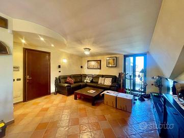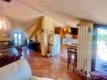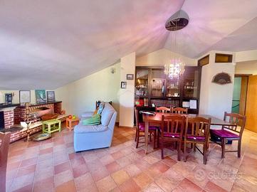La soluzione è suddivisa in zona giorno e zona notte. Accedendo dalla porta d'ingresso blindata, veniamo accolti da un ampio salone living con camino e cucina completa, con angolo cottura. L'ambiente giorno, caldo e accogliente, gode di una doppia esposizione, in particolare a sinistra verso un'ampia balconata mentre a destra, su uno splendido terrazzo a livello di ca. 50 mq attrezzato con tenda da sole e una comoda legnaia.