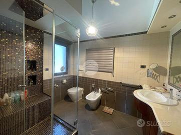Dalla zona giorno accediamo alla zona notte, composta a sua volta da una camera da letto matrimoniale, una cameretta, una cabina armadio, due bagni, totalmente ristrutturati, di cui uno con ampia cabina-doccia emozionale con cromoterapia, seduta e parete a mosaico con tasselli in oro.