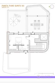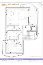L'immobile è disposto su due livelli per una metratura commerciale di 200 mq, al quarto ed ultimo piano, appartamento di tre locali con doppi servizi, dotato anch'esso di terrazzo esposto a Sud.