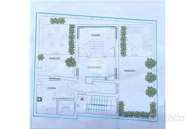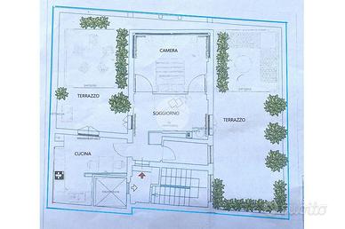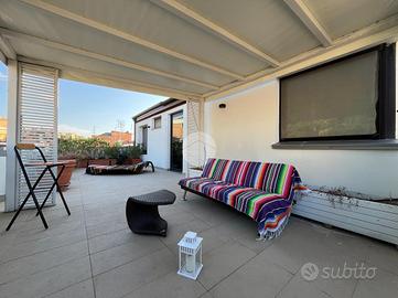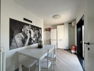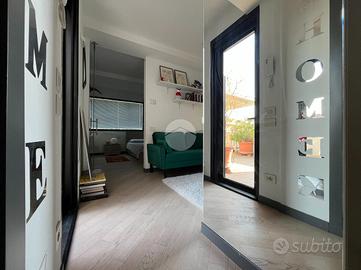 L'ingresso ci accoglie in un piccolo disimpegno, funzionale e riservato, che consente di distribuire ordinatamente l'accesso ai vari ambienti della casa. Da qui si accede alla cucina abitabile, spaziosa e ben organizzata, con affaccio diretto sul terrazzo, perfetta per colazioni all'aperto o per chi ama cucinare con accesso immediato all'esterno.