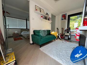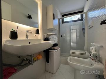 Il bagno è moderno, rifinito con materiali di qualità e dotato di box doccia spazioso e comodo. In una nicchia riservata trova posto un angolo lavanderia, pratico e ben integrato, con spazio per lavatrice e asciugatrice.