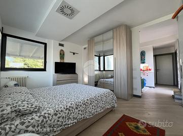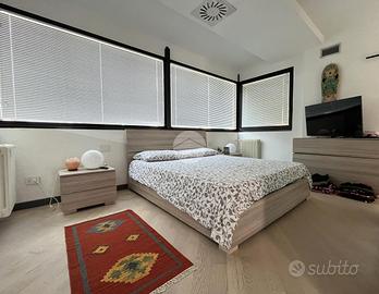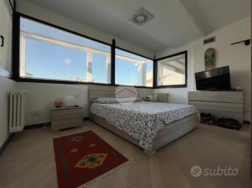 La camera da letto matrimoniale è un ambiente davvero speciale: ampia, tranquilla e ariosa, vanta una parete interamente finestrata che consente alla luce naturale di entrare in abbondanza, creando un ambiente sereno e rilassante. Le ampie vetrate offrono anche un piacevole affaccio sul terrazzo e sul panorama circostante.