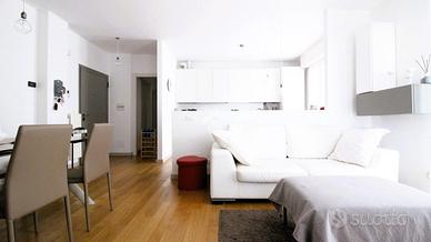 L'appartamento è così suddiviso; ingresso su ampia zona giorno con cucina a vista con affaccio su balcone che ci porta al comodo terrazzo dove poter mangiare comodamente.