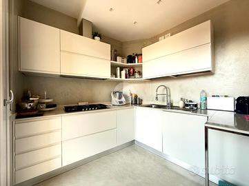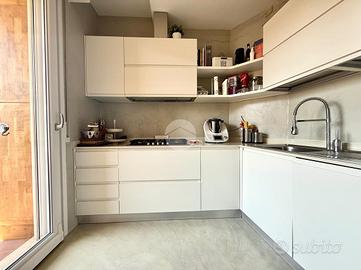 La zona cottura è stata progettata con gusto ed efficienza: un angolo cucina elegante, completo di ogni comfort, che si affaccia su un balcone di servizio riservato, dove trova spazio anche una zona lavanderia comoda e discreta.