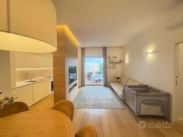 L'ingresso si apre su un luminoso soggiorno con cucina semi a vista, studiato per offrire un ambiente moderno e funzionale. La camera matrimoniale è dotata di bagno en suite con doccia e finestra, rifinito con materiali di ottima qualità. Completano la zona notte una seconda camera matrimoniale e un secondo bagno con doccia. Punto di forza della proprietà è il terrazzo, ideale per momenti di relax all'aperto e per godere di piacevoli affacci.