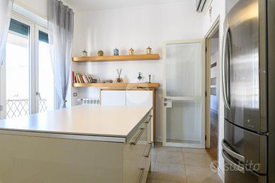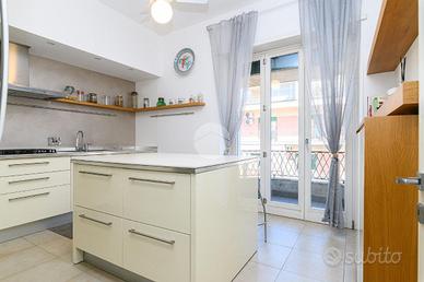 Ingresso con un ampio salone di rappresentanza con zona pranzo e uscita su due balconi e sull'ampio terrazzo di 80 mq, cucina separata all'americana con balcone, zona notte composta da due camere da letto matrimoniali di cui una con balcone, due bagni finestrati, cabina armadio e zona lavanderia.