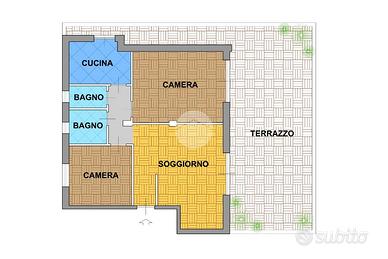 L'immobile si compone di ingresso, soggiorno, due camere, cucina abitabile, due bagni e terrazzo.