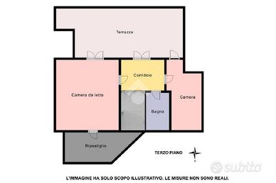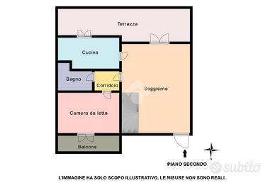 L'appartamento è così composto : Ingresso dal piano secondo su soggiorno luminoso con uscita su terrazzo, cucina abitabile, bagno finestrato con doccia e camera matrimoniale con uscita su un balcone.