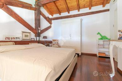 Una scala interna in ferro rivestita in legno conduce al piano superiore, dedicato alla zona notte. Qui le travi in legno a vista, mantenute e valorizzate durante la ristrutturazione, conferiscono un carattere autentico e raffinato. Le tre camere da letto sono tutte di ampia metratura. La camera padronale è dotata di bagno en suite, cieco ma areato tramite ventola di aspirazione, e curato nei dettagli e nelle finiture. Dalla stanza, alcune finestre rettangolari in alto offrono scorci suggestivi sul lago. Le altre due camere, anch'esse spaziose, condividono un secondo bagno finestrato, con box doccia in vetro e sanitari sospesi.