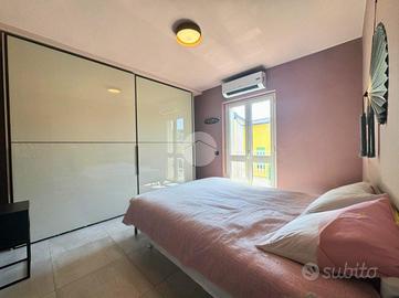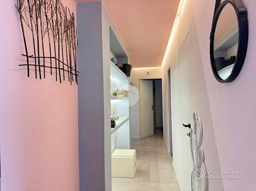 L'ingresso si apre su un ampio soggiorno caratterizzato da vetrate con libera visuale che inondano lo spazio di luce naturale, creando un'atmosfera luminosa e ariosa. La cucina a vista, dal design contemporaneo, si integra perfettamente con l'area living, ideale per momenti di convivialità. Un corridoio conduce alla zona notte, dove si trovano due camere matrimoniali di cui una dotata di un bagno privato, garantendo privacy e comfort. Completa la proprietà un ampio terrazzo abitabile con accesso dal soggiorno e secondo bagno di servizio e una pratica cantina.