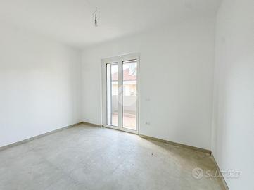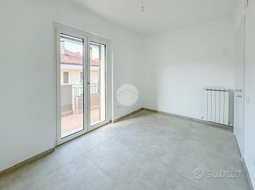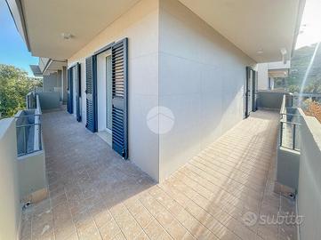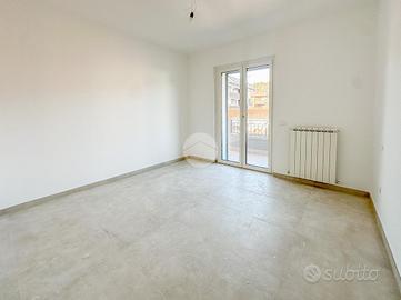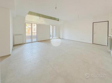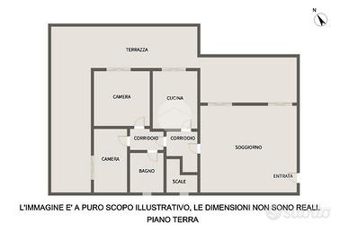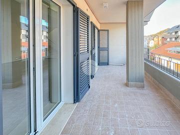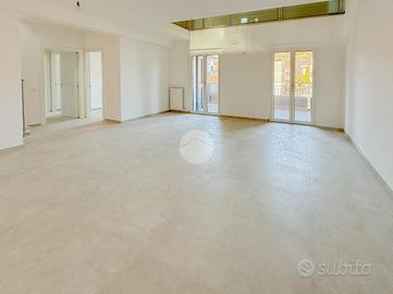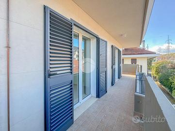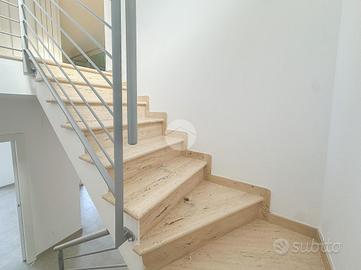 L'ingresso si apre su un ampio soggiorno con accesso diretto al grande terrazzo perimetrale, sul quale affaccia anche la cucina abitabile. Lo stesso piano ospita due camere da letto, entrambe con affaccio esterno sul terrazzo, e un bagno finestrato.