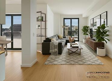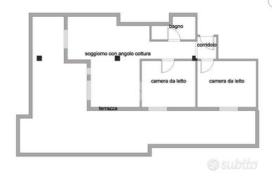 L'appartamento, con una superficie interna di 60 mq e un terrazzo a livello di altrettanti mq, si compone di un soggiorno con angolo cottura, 2 camere da letto e il bagno. Esposizione a sud-est.