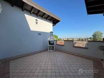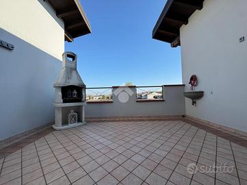 VAILATE: ATTICO CON BOX DOPPIO Appartamento all'ultimo piano, servito da ascensore, disposto su unico livello. Entrando da un elegante androne, si accede alla zona soggiorno con affaccio sulla terrazza di 20 mq, comoda come zona living esterna e servita da barbecue in muratura. Sempre dall'ampio salone con altezza a colmo di 3,90 H si accede alla cucina abitabile con dispensa. Ai due estremi della casa troviamo i due bagni con le due camere da letto entrambe disimpegnate con armadiature. Completa la proprietà il box doppio di 36 mq. Tra i vari accessori inclusi nel prezzo troviamo: -Camino a legna con ventilazione meccanica -Aria condizionata -Zanzariere -Tende da sole Il fabbricato condominiale è composto da 8 unità abitative, è stato progettato con particolare attenzione al design con stile contemporaneo, costruito con materiali di qualità.