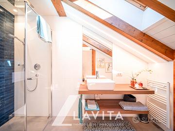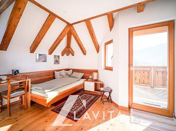 L'appartamento si apre su un ampio e arioso soggiorno con bagno, che si collega a un terrazzo panoramico. Qui la vista sui monti e l'esposizione solare ottimale durante tutto l'anno creano un ambiente molto accogliente. La zona notte, altrettanto luminosa, è composta da due ampie stanze da letto e un ulteriore bagno, completato da un balcone.