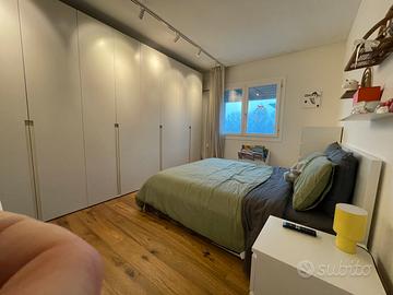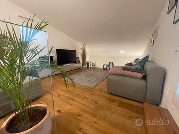 Vendo attico così composto : Soggiorno living con angolo cucina , disimpegno con due camere da letto matrimoniali di cui una con bagno in camera e altro bagno. Al piano superiore accedendo da scala interna soppalco di 18 mq più balcone con vista di 30 mq. Appartamento curato nei minimi dettagli , parquet in tutte le stanze. No gas , si utilizza solo la corrente con pannelli fotovoltaici per riscaldare l'attico. Completa la proprietà vero garage doppio in larghezza (2 accessi) e cantina al piano interrato. Euro 550.000 Disponibile da 12/2026 Vera occasione