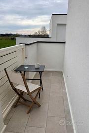 La zona giorno si compone di ampio soggiorno open space, illuminato da due grandi portefinestre e angolo cottura, un bagno finestrato con doccia. A completare questo spazio un balcone vivibile che affaccia sul verde retrostante al condominio.